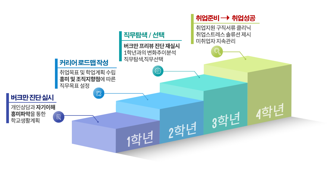 버크만 진단 분석을 바탕으로 한 학년에 맞는 진로코칭으로 성공적인 대학생활과 미래설계를 제공하는 프로그램입니다.